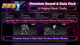 SUPER ROBOT WARS Y - Премиум Звук & Дата Пак является платным DLC от Bandai Namco Forge Digitals Inc., улучшая базовую игру 31 аниме тематическими песнями, 15 оригинальными треками, справочными материалами и бонусной миссией. Хотя это погружающий опыт, его высокая цена за ограниченное содержание может отпугнуть некоторых игроков.